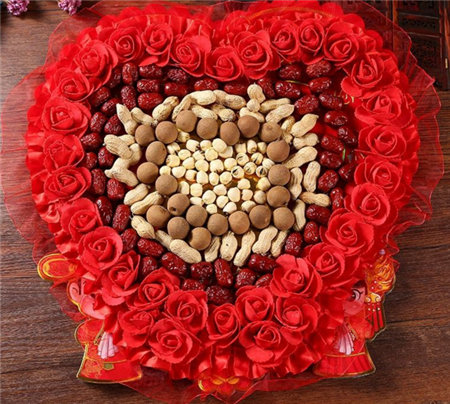 在結婚的前一天晚上,要由女方家出一個家庭和睦、父母雙全、又育有兒子的男丁安裝婚房里的婚床,再將寓意早生貴子的四品:核桃、蓮子、紅棗、花生鋪在新床上面。